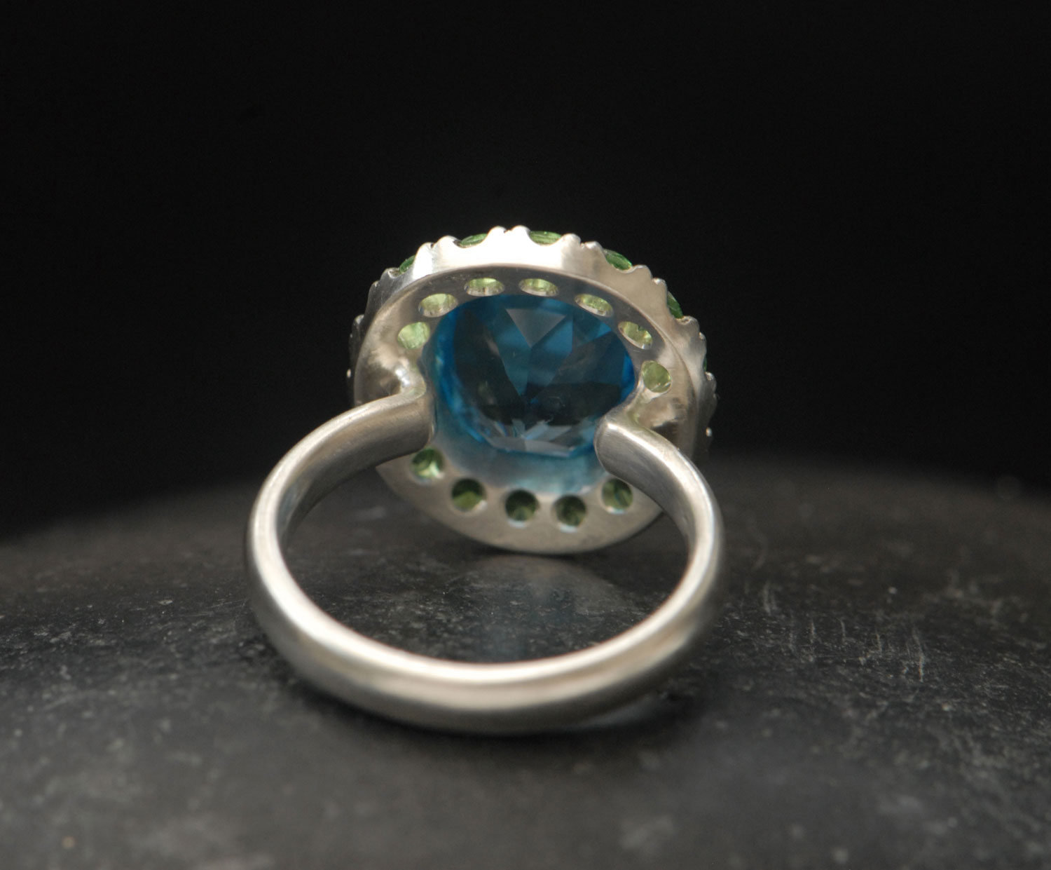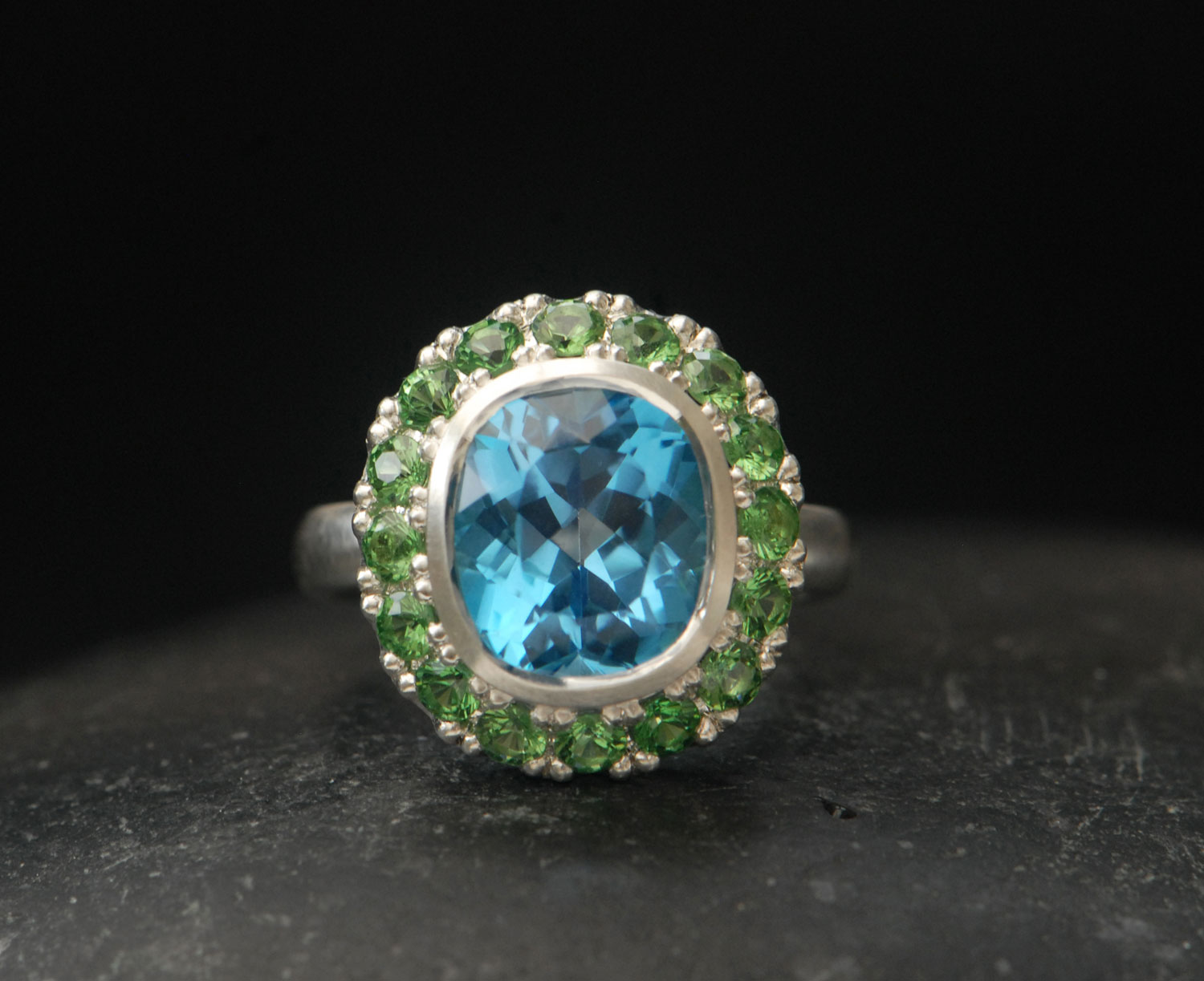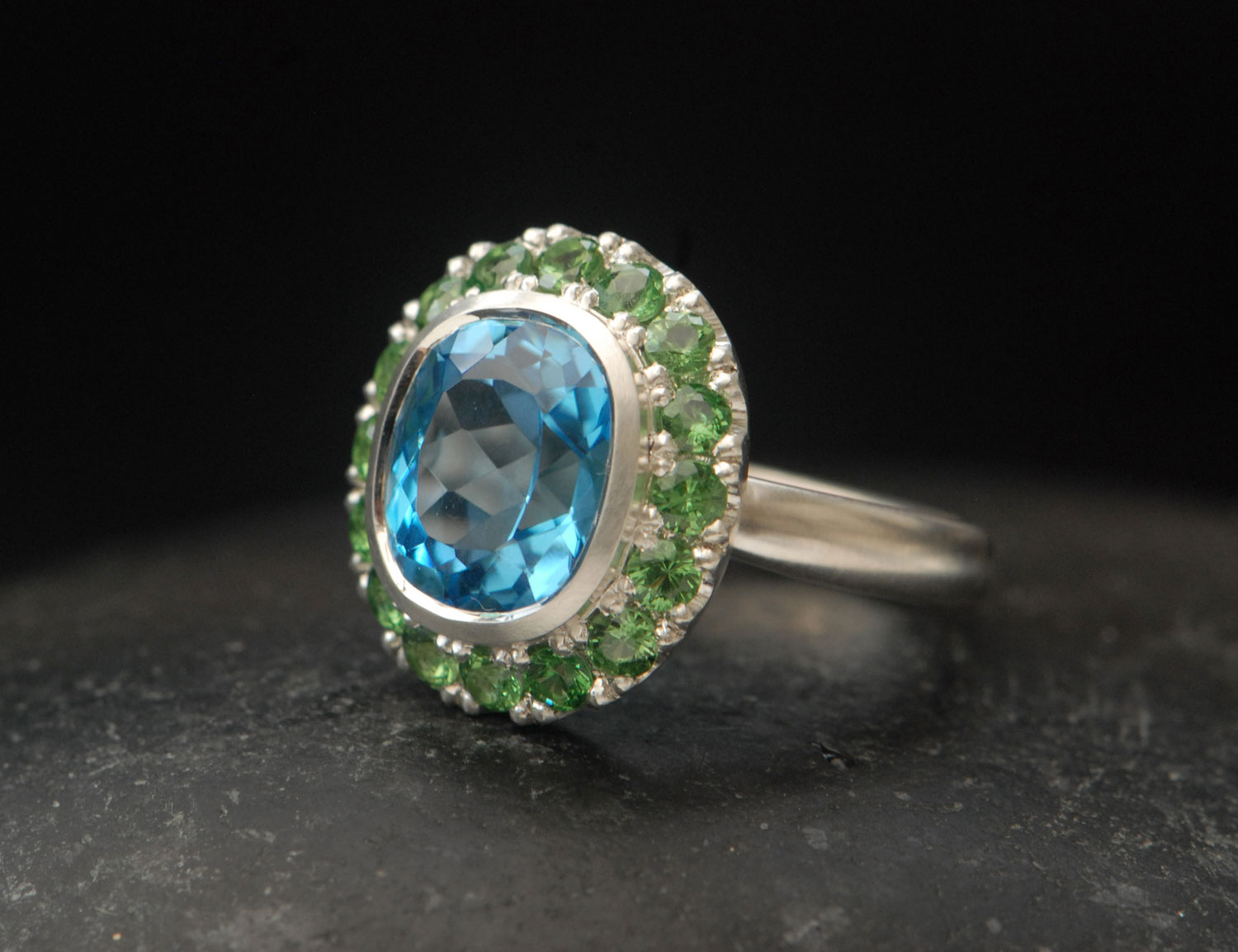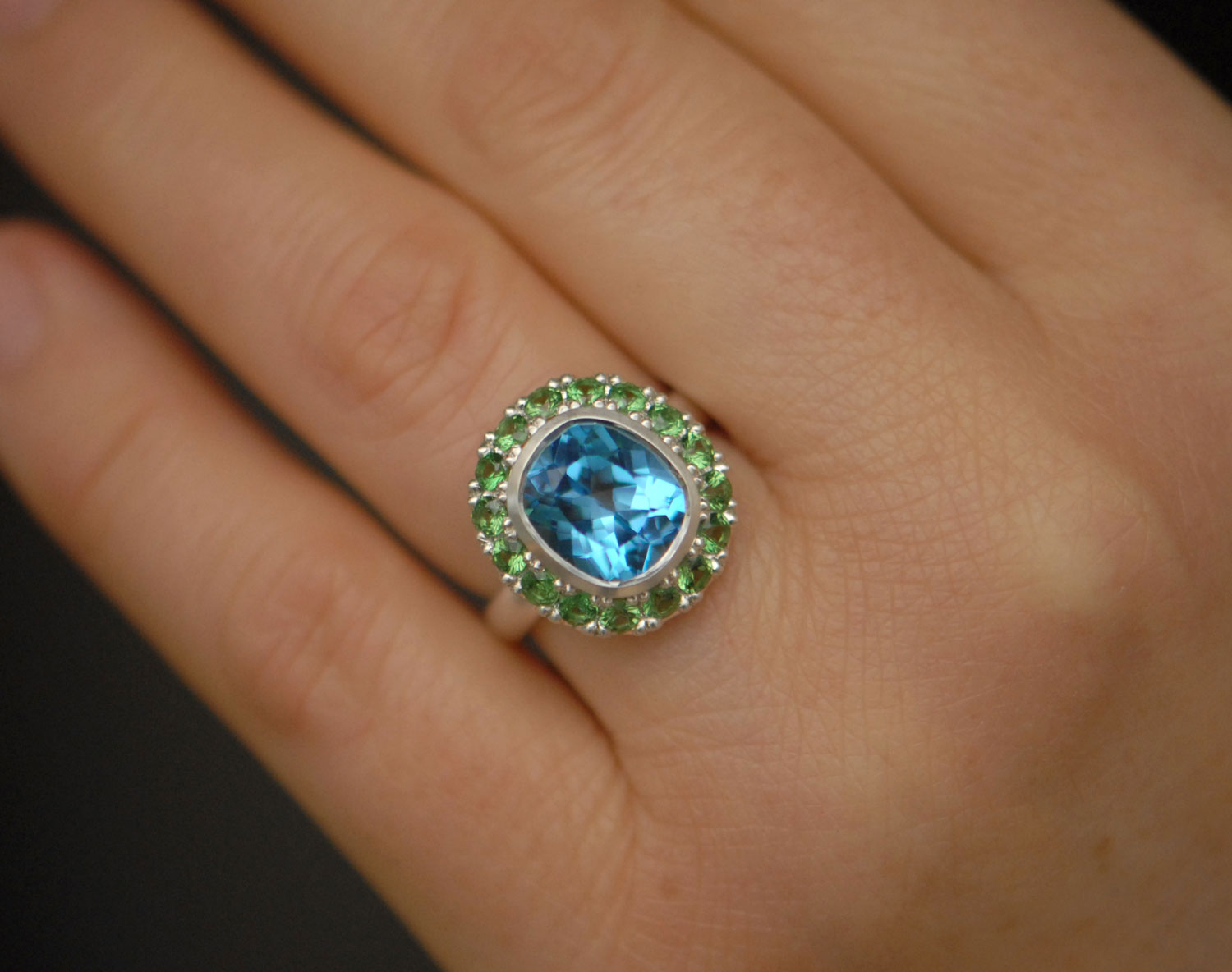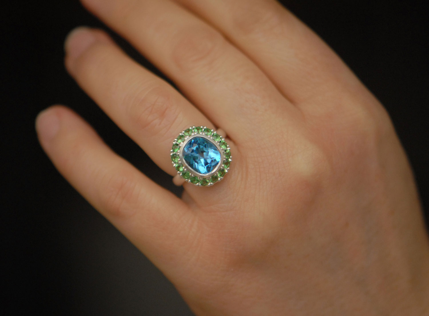 Big Swiss blue topaz halo ring with tsavorite garnets set in silver.