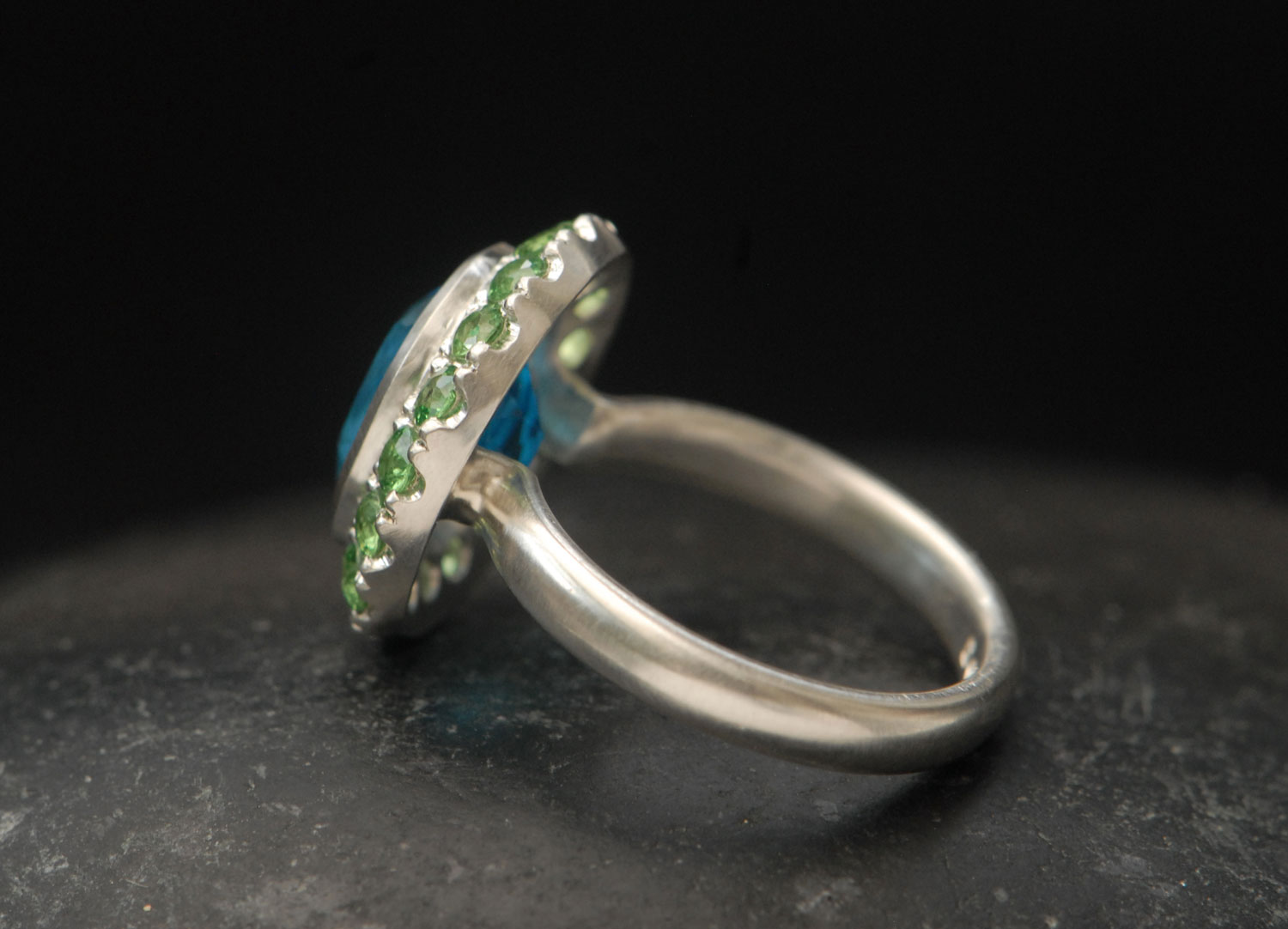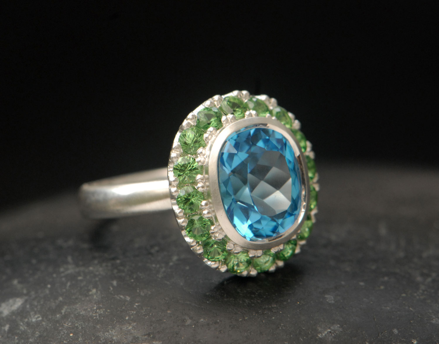 Vibrant Swiss blue topaz halo ring set in a satin finished sterling silver with little green tsavorite garnets set around it.