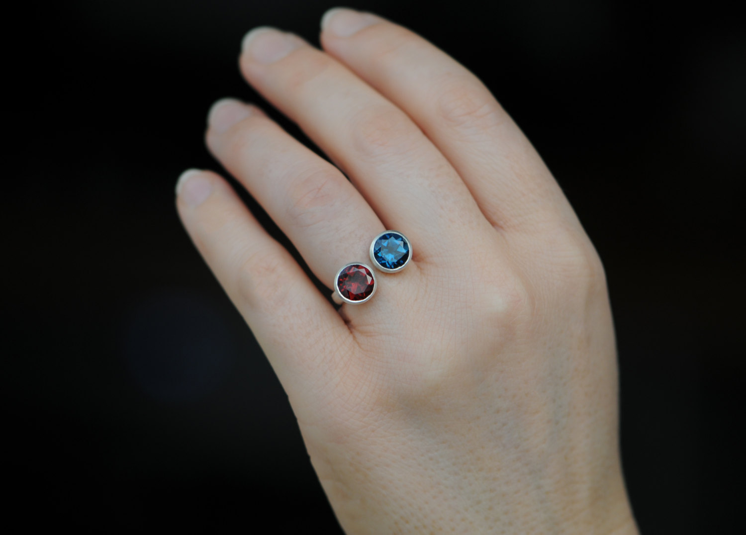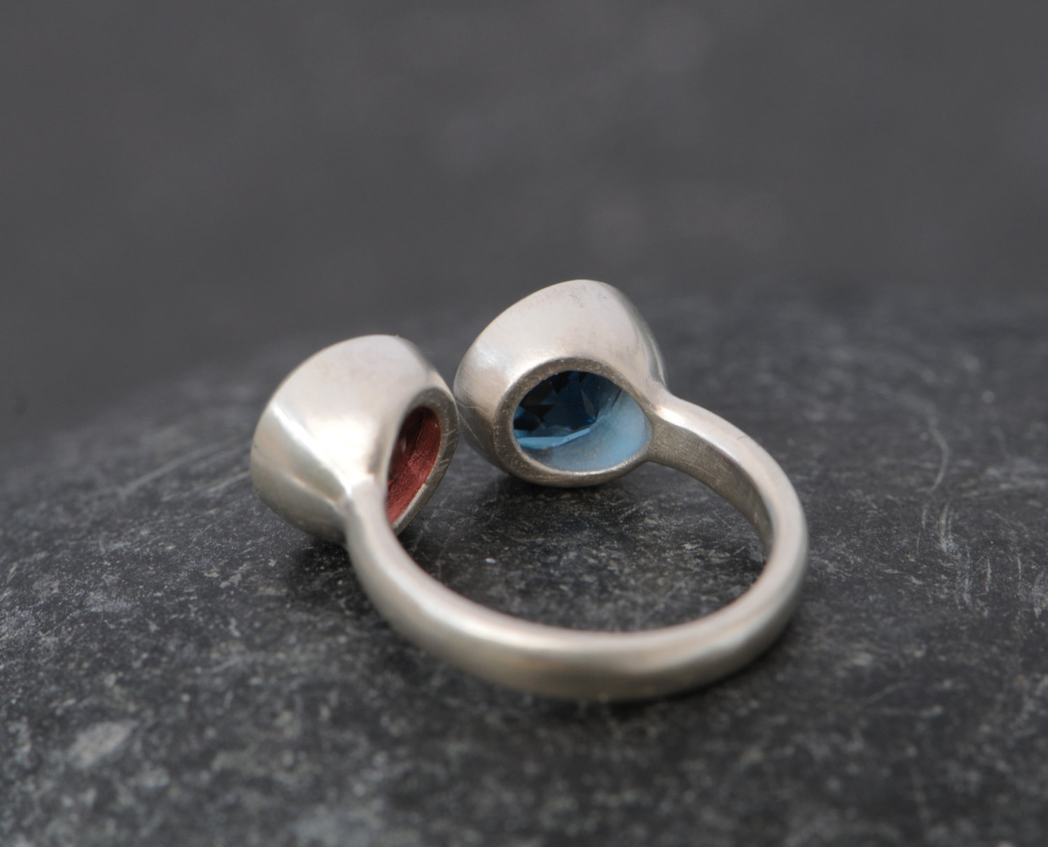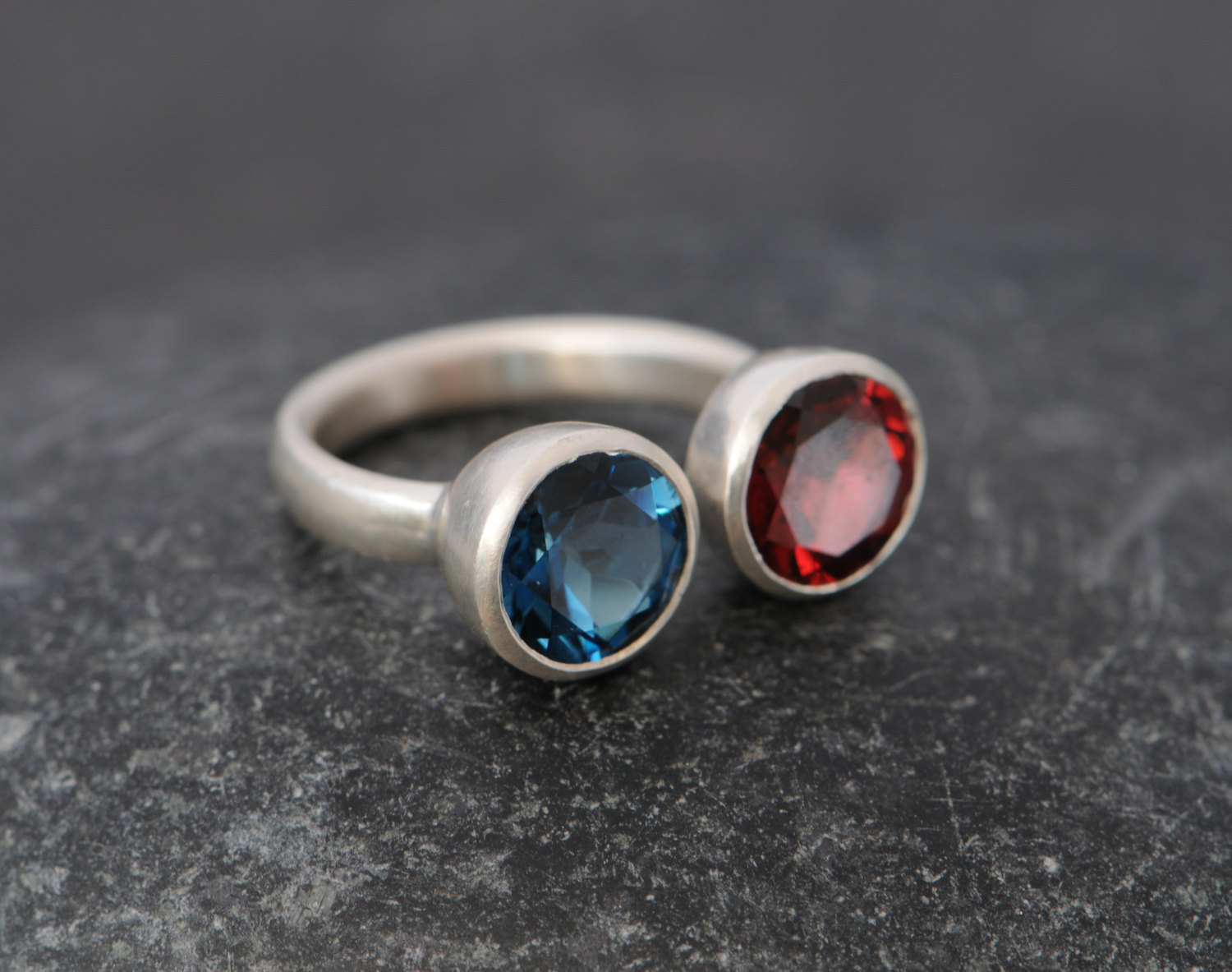 Red garnet and London blue topaz, set in satin finished sterling silver.